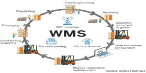 A complete WMS workflow illustrating how inventory moves through receiving, stocking, barcode printing, replenishment, and dispatch stages in modern warehouse operations.